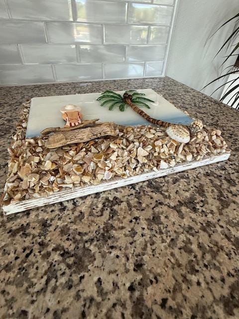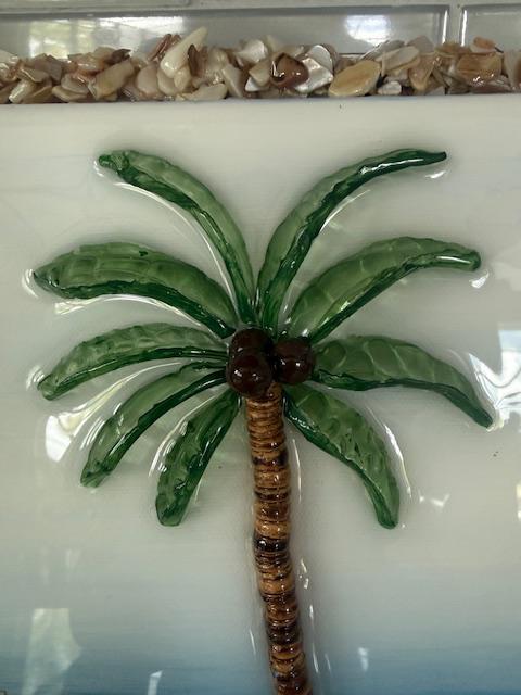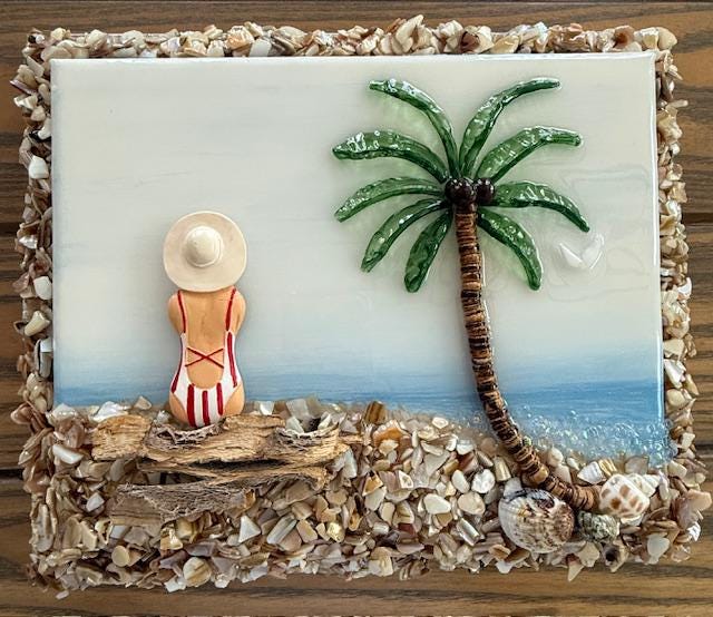 This 8" x 10" Girl On A Beach is immersive and extends beyond the canvas and onto the frame itself. It transitions from a traditional "framed painting" into a full-scale sculptural assemblage. Here are the standout features of this coastal scene: Integrated Shell Artistry * The "Hill of Shells": Using authentic shells to create the topography of the hill adds a tangible, heavy texture that grounds the piece. It creates a physical foundation for the scene that feels like a literal piece of the shoreline. * The 3D Shell Frame: This is a rare finishing touch. By crafting the frame entirely from shell fragments, the border becomes a continuation of the artwork rather than just a container for it. This "mosaic" framing style blurs the line between the art and the display. Narrative & Composition * Hand-Cut Glass Palm: The "swaying" effect is likely achieved through the precise angles of the hand-cut glass, which provides a sleek, reflective contrast to the matte, organic surface of the real shells. * Driftwood Element: The driftwood bench provides a natural seat for the figure, bridging the gap between the painted background and the 3D foreground. * Gazing Toward the Horizon: A solitary figure looking outward—evokes a sense of peace, reflection, and "island time."